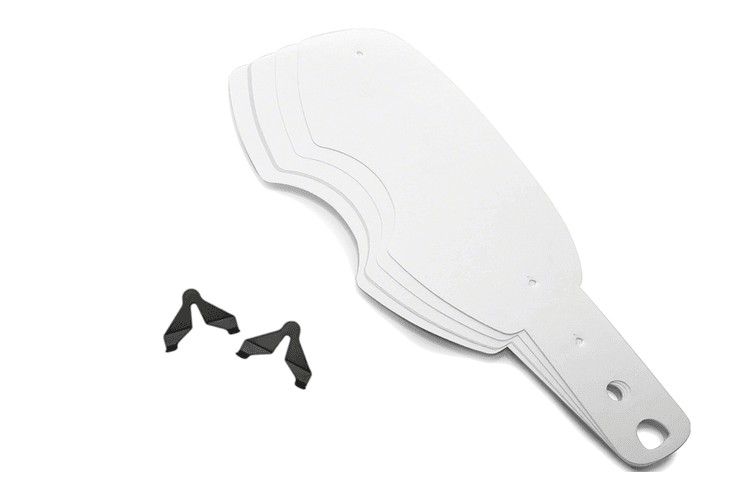 Este sistema le permite apilar hasta seis cortes de Mylar® de calidad óptica en las gafas MX L Frame®, por lo que incluso durante un triple, puede aclarar instantáneamente su visión con un tirón rápido. Las pestañas están diseñadas para agarrarlas fácilmente, y las capas evitan que la suciedad manche los rasgones no utilizados. • Carga rápida, fácil y despliegue ultrarrápido • Tecnología de capas para mantener limpias las hojas no utilizadas